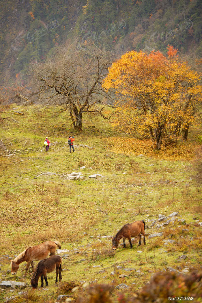 卧龙卓西牧场秋天的彩林与棕色的马儿