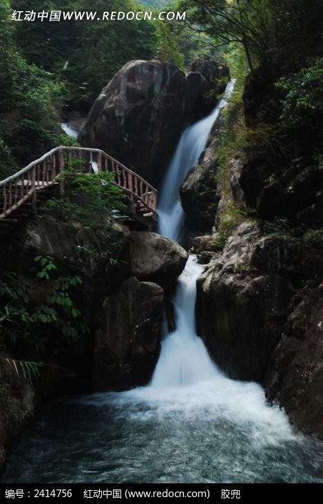 栈道旁边的瀑布和水潭