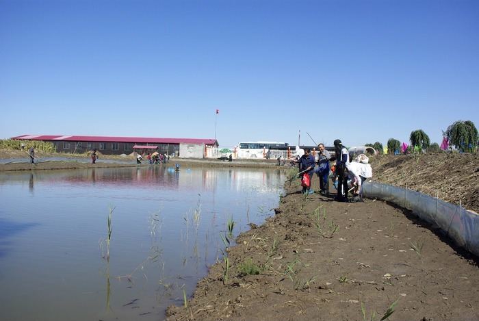养殖场钓螃蟹的人