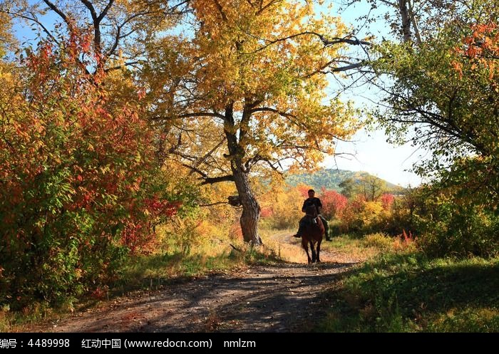 骑手在秋林小路行走
